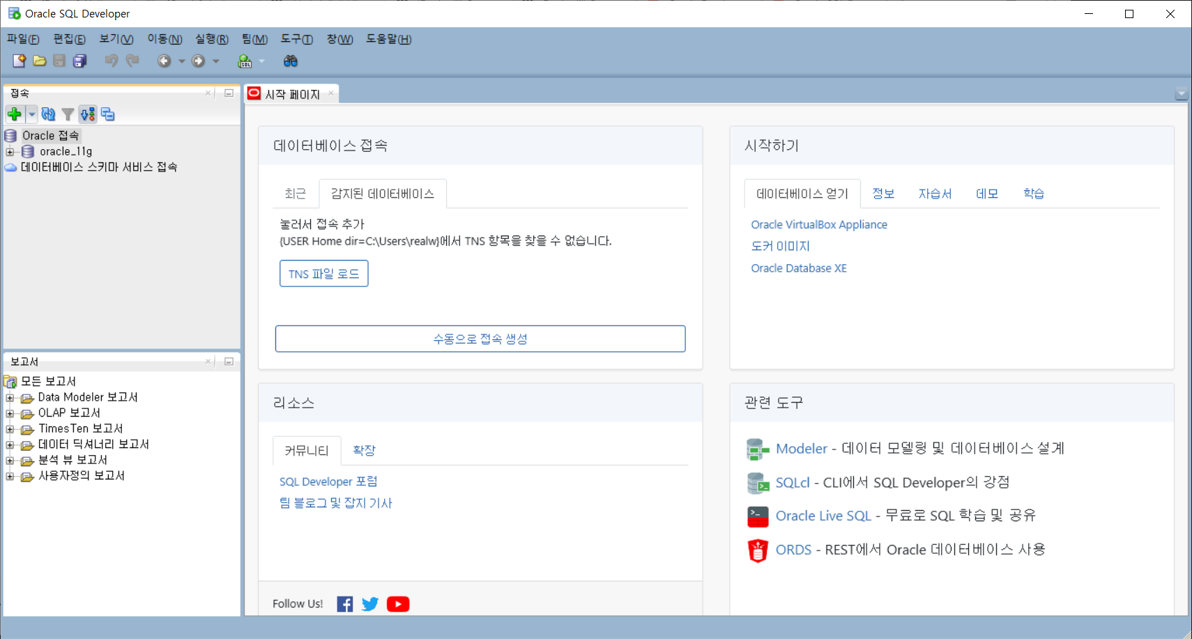 7. '접속' 버튼을 누른 이후에 화면 좌측 'Oracle 접속' 아래에 'oracle_11g'가 생성되었습니다.