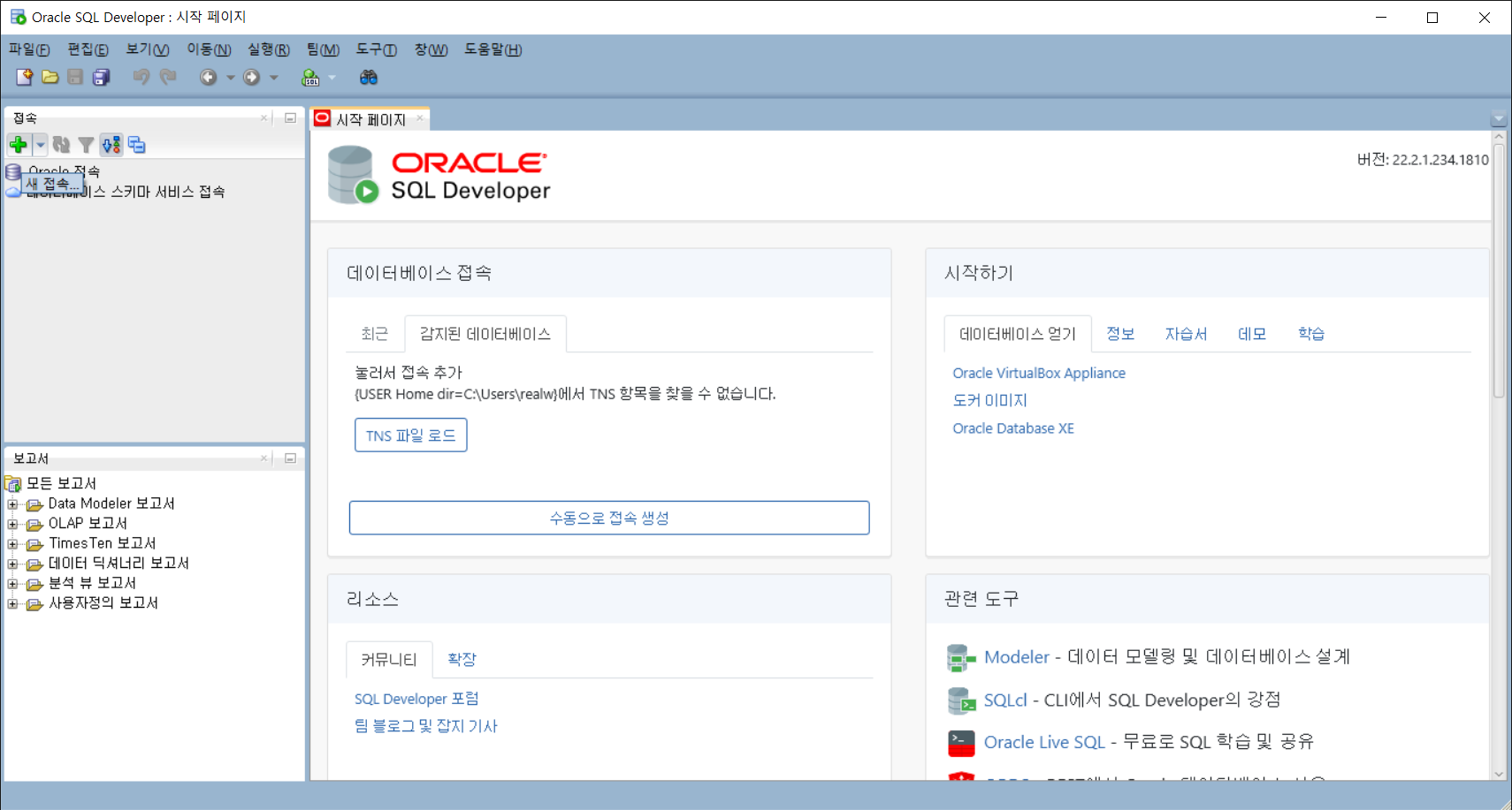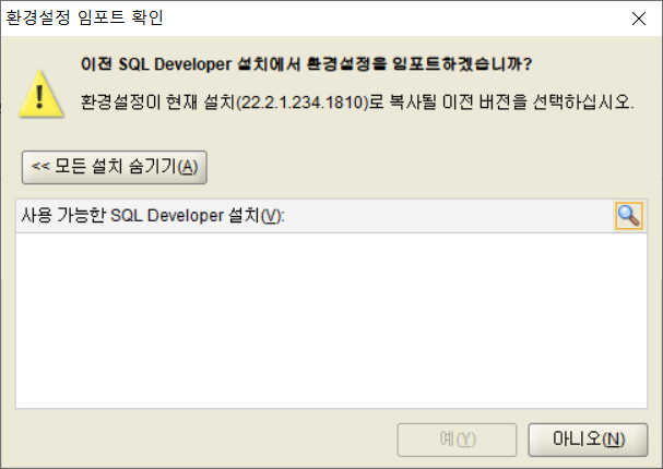 3. sqldeveloper 를 실행합니다. 처음 실행하면 아래와 같은 화면을 보실 수 있는데 '아니오'를 선택하시면 됩니다.