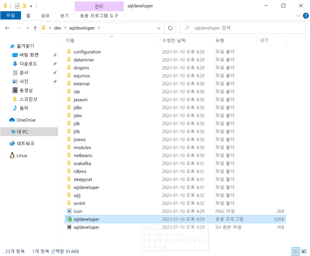 2. 다운로드 받은 파일을 'c:\dev\sqldeveloper\' 경로에 압축을 풀었습니다.
