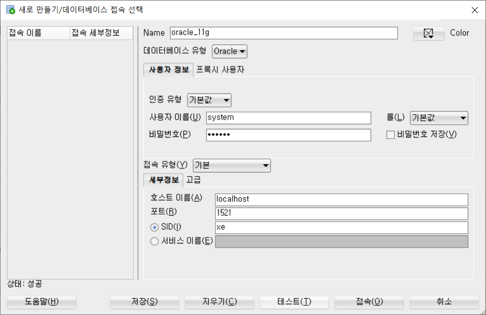 6. Name에는 'oracle_11g', 사용자 이름에는 'system', 비밀번호에는 'oracle'을 입력하였습니다. 화면 하단의 '테스트' 버튼을 누르시면 하단 좌측에 '상태: 성공'이라는 메세지가 나옵니다. '접속' 버튼을 눌러줍니다.
