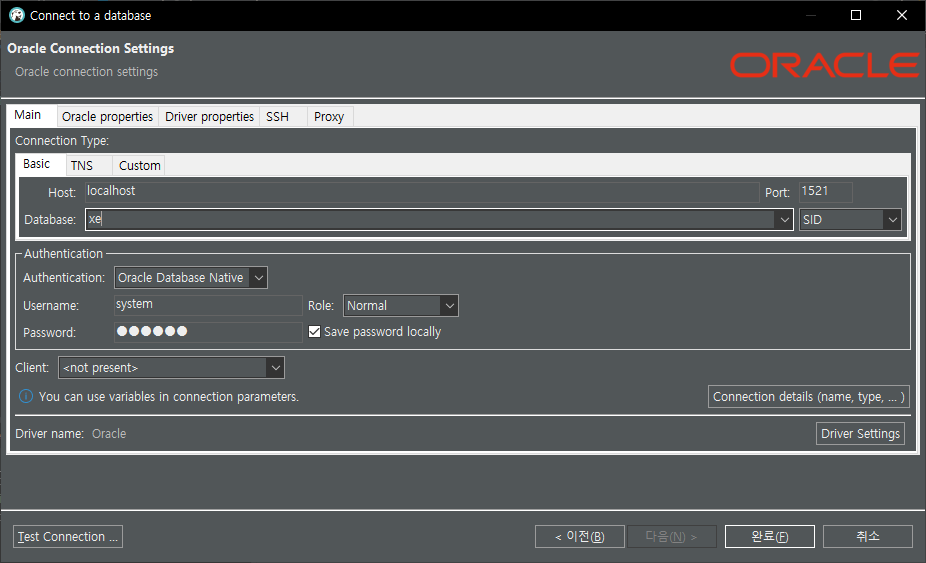3. 연결할 데이터베이스에 대한 설정 화면입니다. 각 항목에 다음의 내용을 입력하거나 선택합니다.