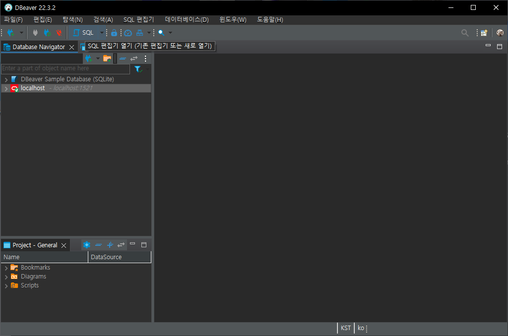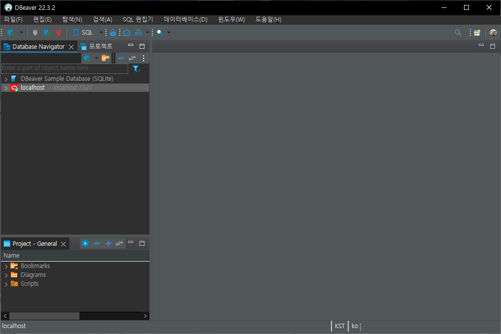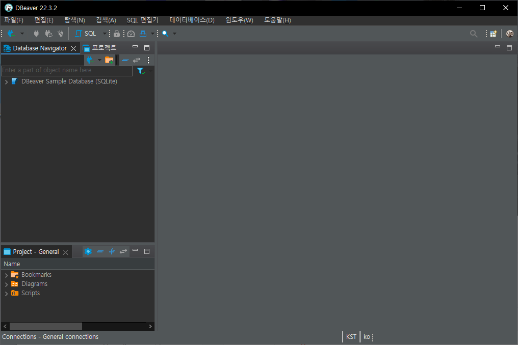 1. DBeaver 설치가 완료된 뒤 실행한 화면입니다.